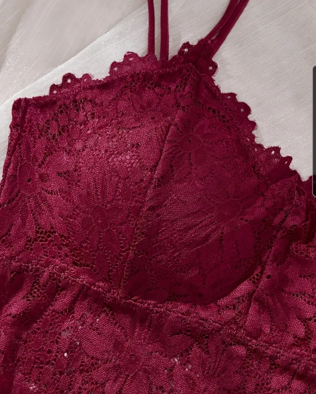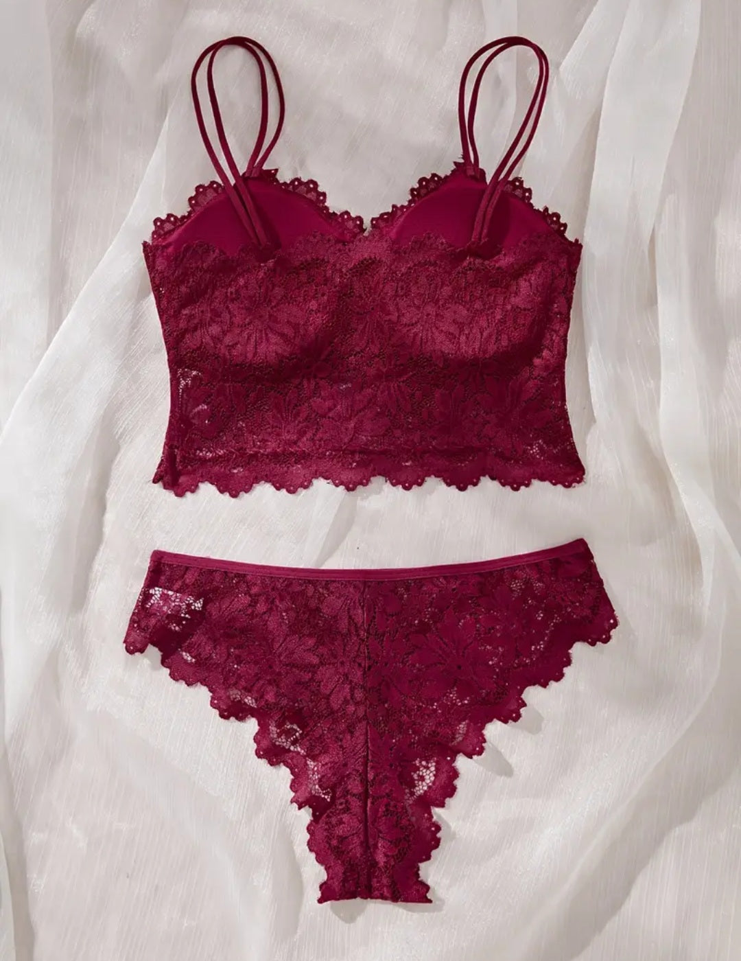 Wrap yourself in the elegance of a secret worth sharing. The Scarlet Whisper Lace Set features a stunning deep burgundy hue and intricate floral lace that caresses the skin with every curve. The soft bralette offers light support and delicate double straps, while the matching lace panties are cut to flatter and tease. Whether itβs for a quiet night in or a confident layer under your daywear, this set whispers luxury, romance, and irresistible charm.